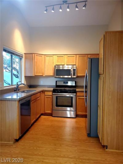 This beauty won't last! DOWNTOWN SUMMERLIN Single Story 3 bedroom home with open floor plan, high ceilings, and a very private backyard. This home features new wood laminate flooring throughout and porcelain tile in the bathrooms with new quartz countertops. All new solar screens have been added to windows, and a Nest thermostat to make for an energy-efficient home. Covered patio area in the backyard, as well as a second paved sitting area addition. The living room features an open layout and a fireplace. The kitchen includes stainless steel appliances and new quartz countertops. The dining room area features an upgraded sliding glass door that looks out into a private tree-lined backyard. The property is close to Downtown Summerlin, featuring many sought-after shops and restaurants with easy freeway access.